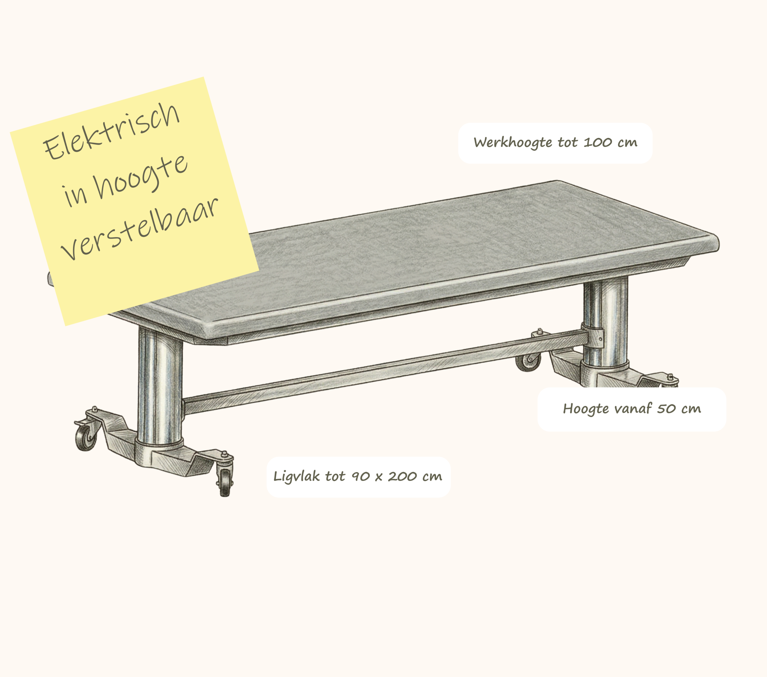 Cura is volledig aan te passen aan elke specifieke wens en behoefte. Het ligvlak maken wij op maat tussen 80 x 140 cm tot 90 x 2000 cm. Als het nodig is, dan kan deze voorzien worden van een opstaande rand of opstaande panelen. Voor de bediening van het hoog-laag systeem is er de keuze uit een handbediening, voetpedaal of een aan het ligvlak gemonteerd bedieningspaneel.
