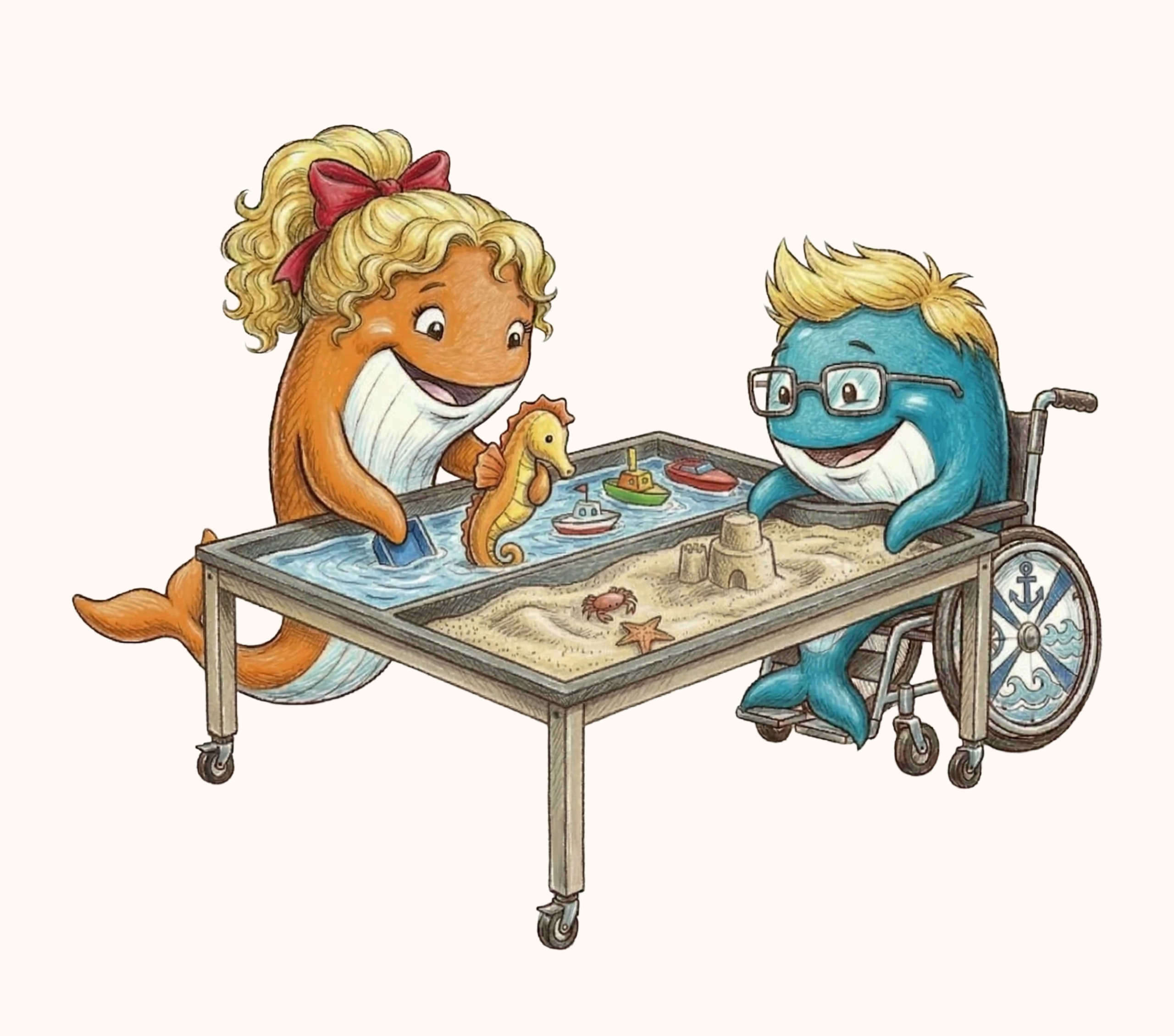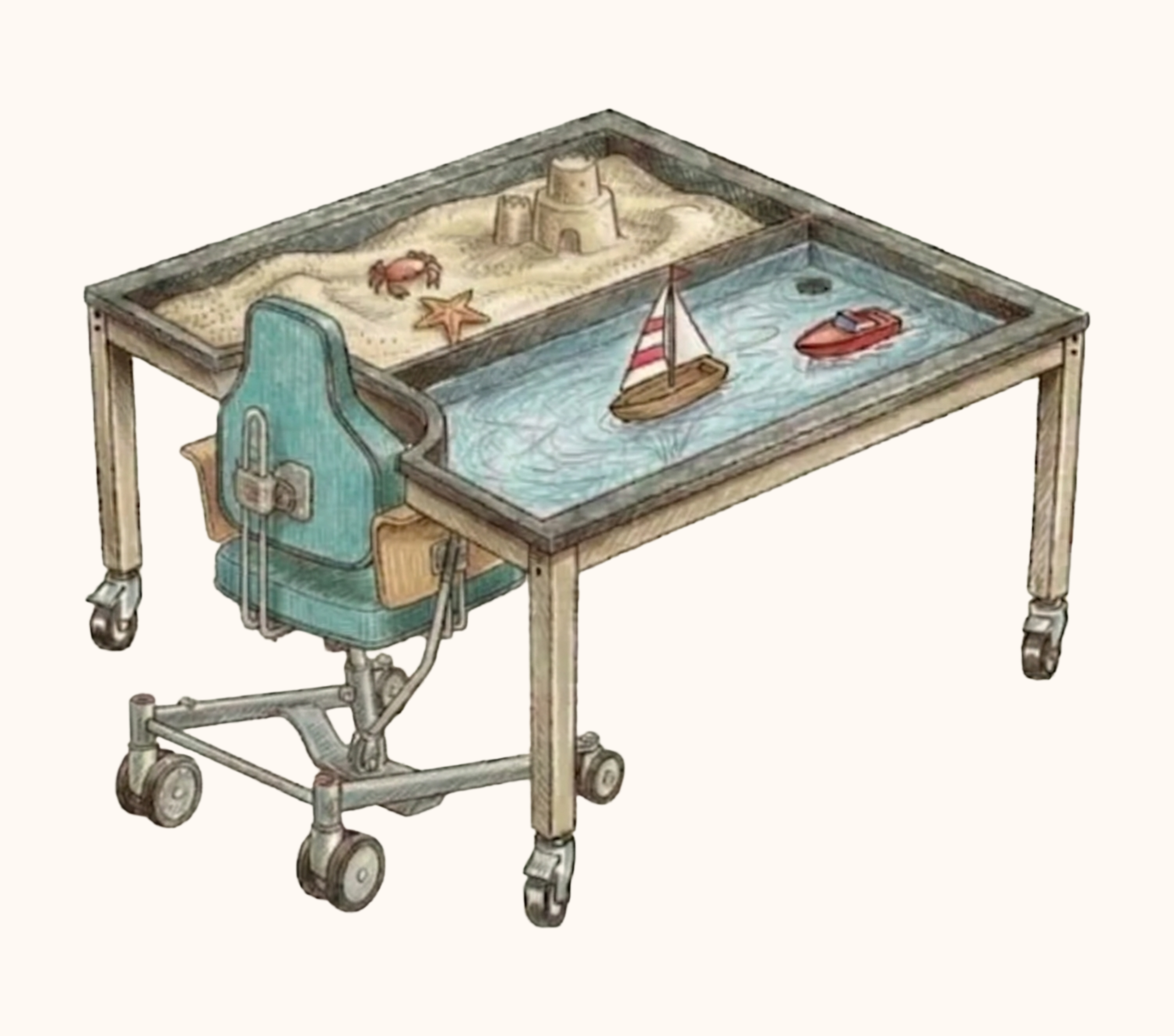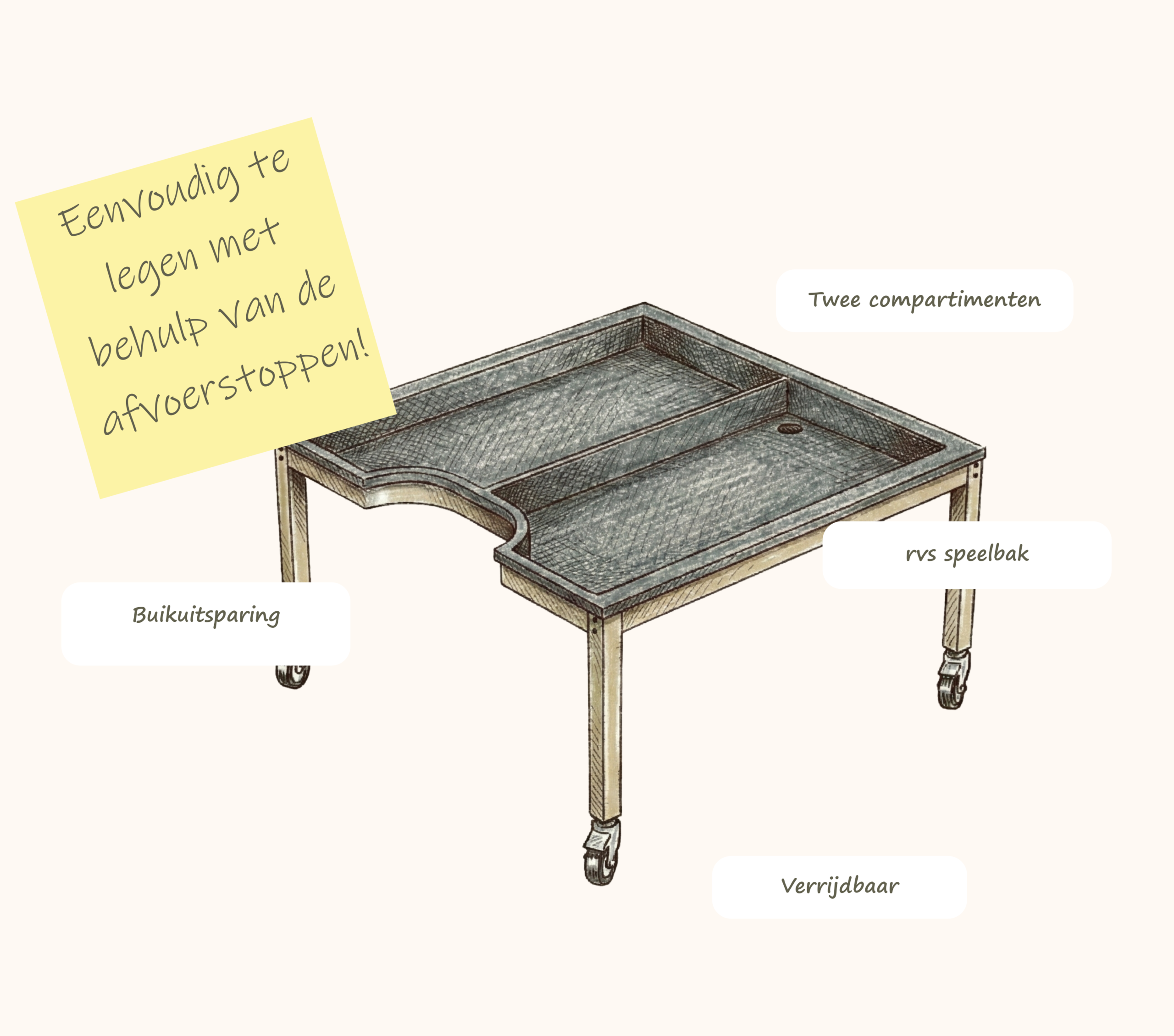 Een zand- en watertafel waar iedereen aan kan spelen.